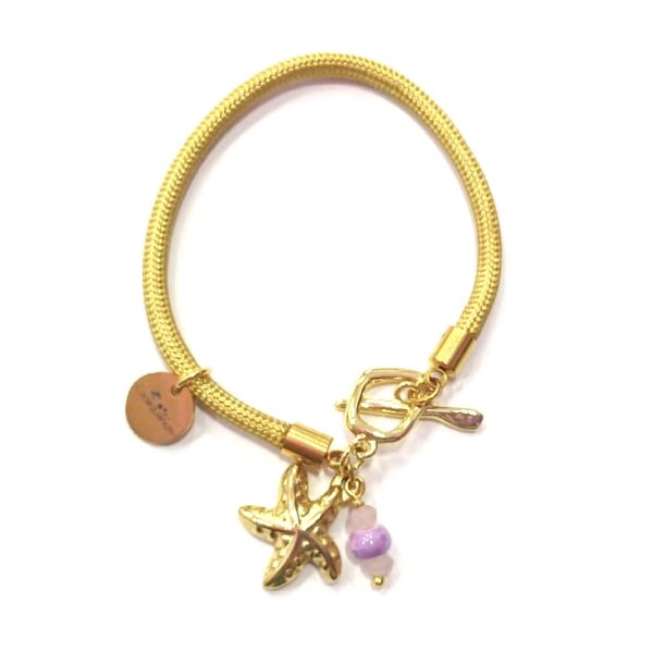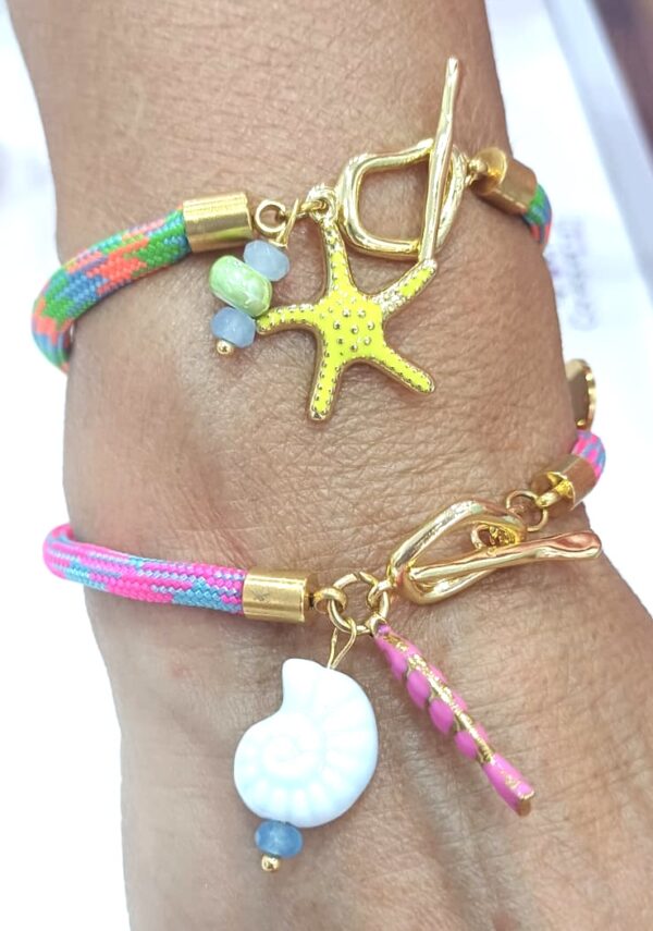 Lleva contigo el espíritu fresco y alegre del mar con las pulseras Sandy. Cierres dorados ajustables decorados con preciosos charms, estrellas de mar , porcelánicos y esmaltados . Su diseño versátil y colorido aporta un toque moderno y lleno de vida a cualquier outfit.