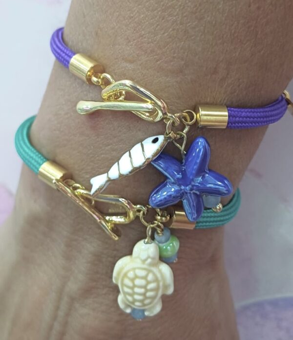 En el centro, cuelgan encantadores charms que capturan la esencia marina y vibrante:
